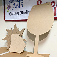 Mosaics with Jenny Fridays4-6 p.m. Each Wood Shape has a Price and then we add $15 for the Class fee for 2/2 hr classes. We glue the glass down first in your design and then the next class you will grout the piece. We have many different Shapes and Colors of Glass to work with.